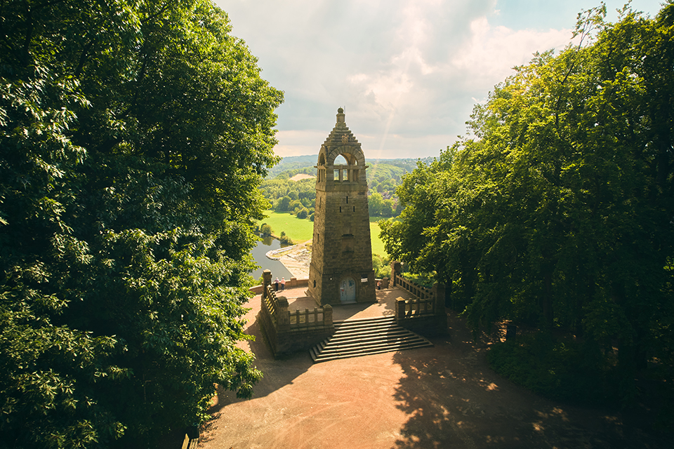 Im Bochumer Stadtpark können Sie den 34 Meter hohen Bismarckturm erklimmen. Beim Aufstieg erwarten Sie in den einzelnen Etagen kleine Fotoausstellungen. Die Turmspitze belohnt dann mit einem wunderbarem Rundumblick – unter anderem auf die Innenstadt und das Stadion des VfL Bochum.